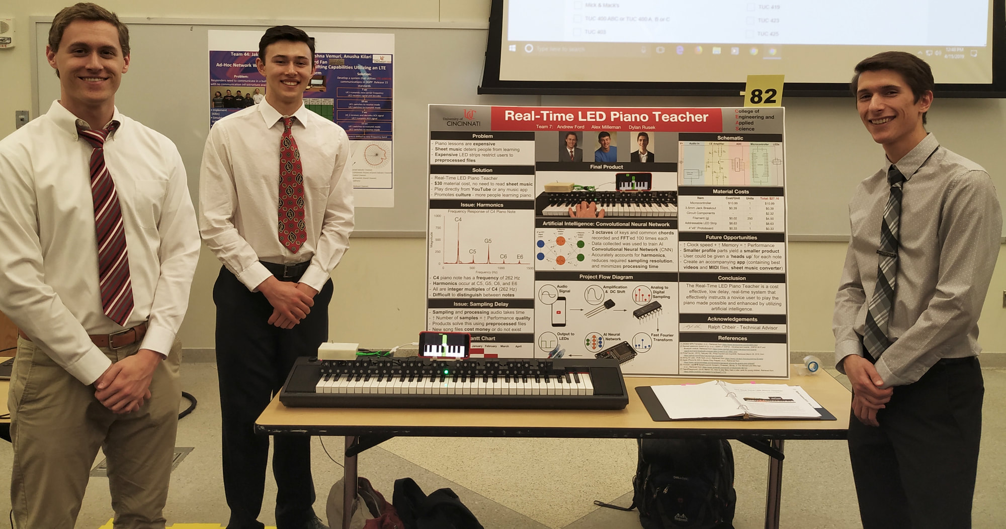 The Real-Time LED Piano Teacher was the culmination of my undergraduate studies at the University of Cincinnati. My close friends Dylan Rusek and Alex Milleman joined me in the design of a device that allows for taking a YouTube video, analyzing the frequencies present, and illuminating the LEDs above the piano key corresponding to the note in the audio. It was challenging to boil down a neural network into the small amount of memory available on the ESP-32 chip, as well as addressing the harmonics present with every note. Our group won Most Outstanding Design, and presented at the regional IEEE awards banquet in Spring 2019.